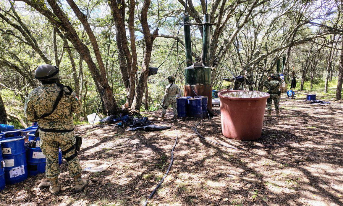 El hallazgo se logró durante patrullajes a pie efectuados por las fuerzas armadas, con la finalidad de reconocer el terreno y detectar más indicios relacionados con la producción de drogas sintéticas. En este segundo laboratorio se aseguraron 1,790 litros de un químico aún por identificar, 528 kilos de sustancia granulada cristalina, tres destiladores metálicos y tres reactores de acero inoxidable.