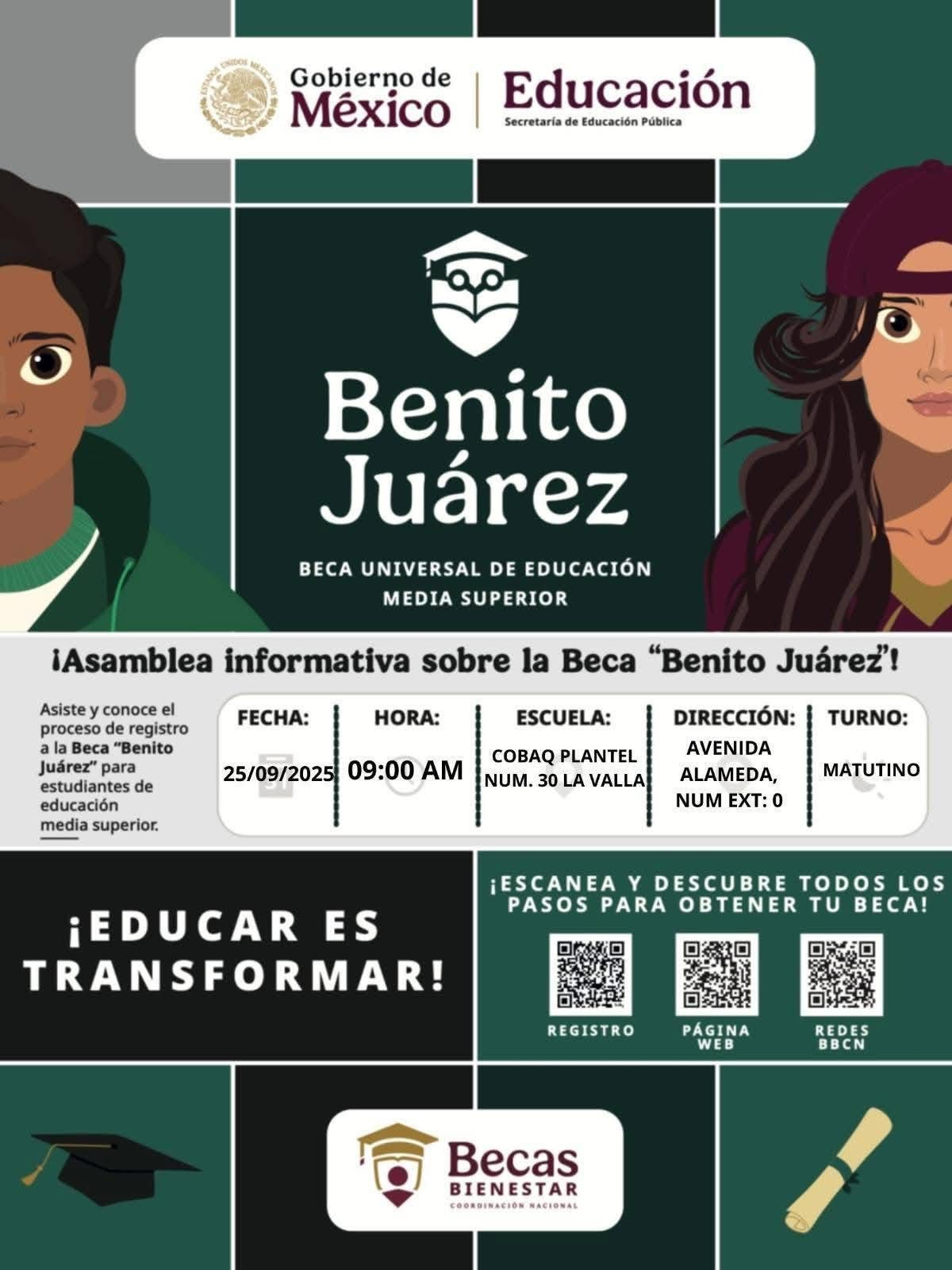 A partir del lunes 22 de septiembre comenzarán las asambleas informativas dirigidas a estudiantes de nivel medio superior y superior, con el objetivo de orientarles sobre el proceso de solicitud de las becas Benito Juárez y Jóvenes Escribiendo el Futuro.