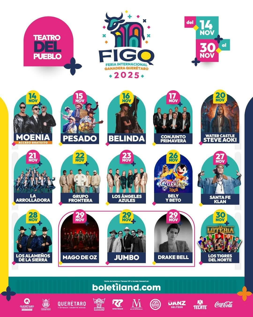 Te dejamos los artistas que se presentarán en el teatro del pueblo en la feria internacional ganadera Querétaro 2025 Posted on septiembre 19, 2025septiembre 21, 2025 By Centro de Redaccion No hay comentarios en Te dejamos los artistas que se presentarán en el teatro del pueblo en la feria internacional ganadera Querétaro 2025 Entrada a la feria internacional ganadera de Querétaro costará $100 Teatro del pueblo Viernes 14 con acceso gratuito Moenia Sábado 15 pesado Domingo 16 Belinda Lunes 17 Conjunto Primavera Jueves 20 Steve Aoki DJ internacional Viernes 21 la arrolladora Sábado 22 grupo frontera Domingo 23 Los Ángeles Azules Miércoles 26 Beltrán y Beto Jueves 27 Santa Fe Klan Viernes 28 Los Alameños de la Sierra Sábado 29 Drake Bell Sábado 29 Jumbo Sábado 29 Mago de Oz Domingo 30 Los Tigres del Norte Politica, Princioal Novedades, Sociedad