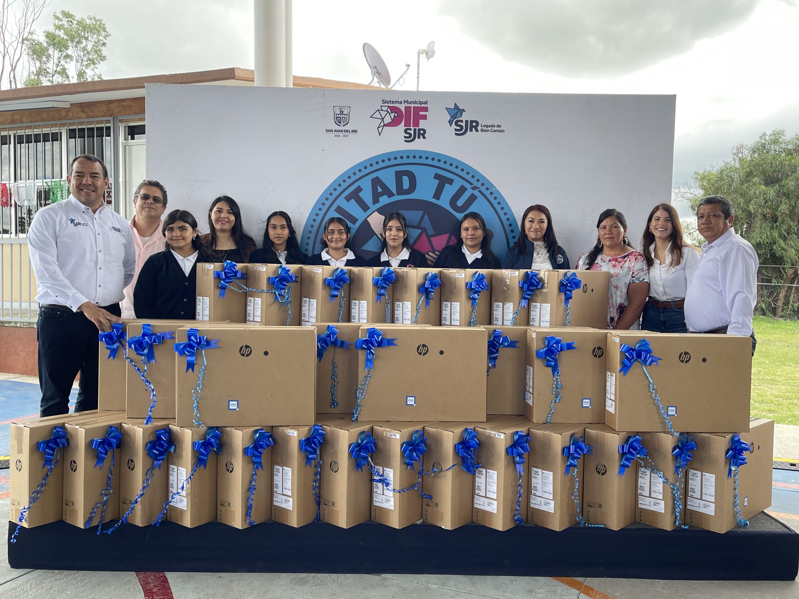 El DIF Municipal de San Juan del Río entregó 30 computadoras a la Telesecundaria Francisco Villa gracias al programa Mitad Tú, Mitad Yo